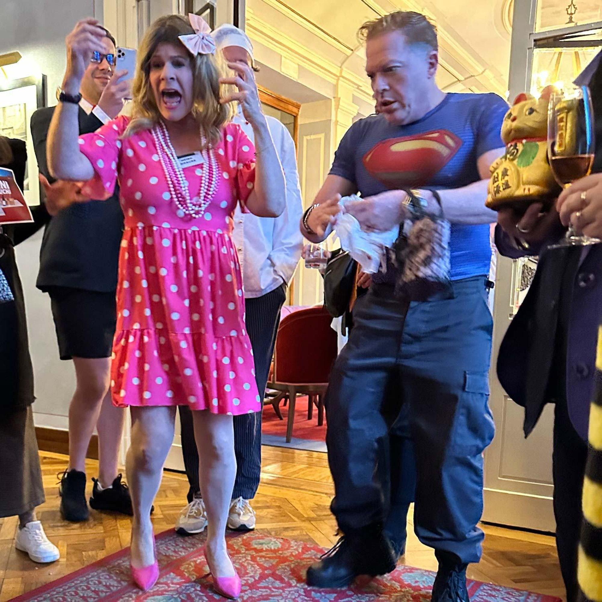 Hinter den Kulissen beginnt jedes Wochenende mit herzlichen Begrüssungen. Vier Tage hat man sich nicht gesehen, und doch fühlt es sich an wie ein Wiedersehen unter alten Freunden. Es folgen Hotelbesichtigungen, bei denen sehr praktische und existenzielle Fragen geklärt werden müssen («Wer stirbt wo?»): Wie kommt man als Tote ungesehen zurück ins Zimmer? Darf man Kunstblut verwenden oder leidet der Boden darunter? Dann folgen Soundcheck, Sitzordnung und schliesslich ein kurzer gemeinsamer Apero. «Um etwa 18.30 Uhr ziehe ich mich in mein Zimmer zurück, ziehe mich an, schminke mich und gehe nochmals übers Script», erzählt sie. Und eine Stunde später geht die dreitägige Mörderjagd los.